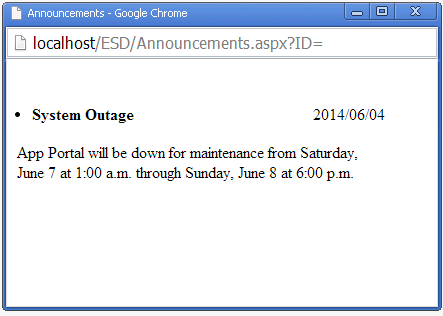 You use the Communication > Announcements view to add announcements to the App Portal site. Announcements are displayed on the top right corner of the browser window.