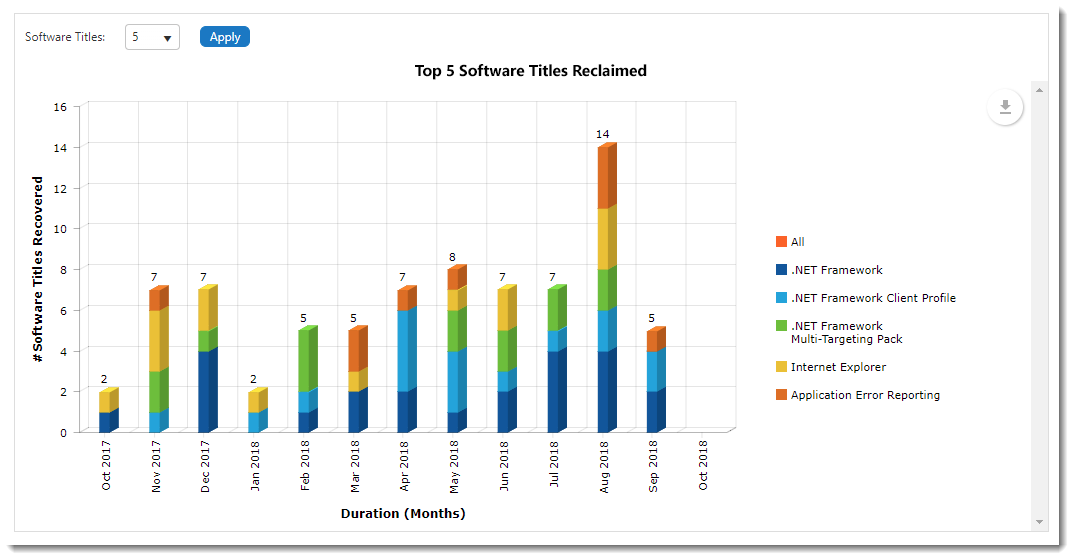 The number of titles displayed in the graph is based upon the number selected in the Software Titles drop-down. Selectable values are 5, 10, 25, 50, 100. The default is 5.