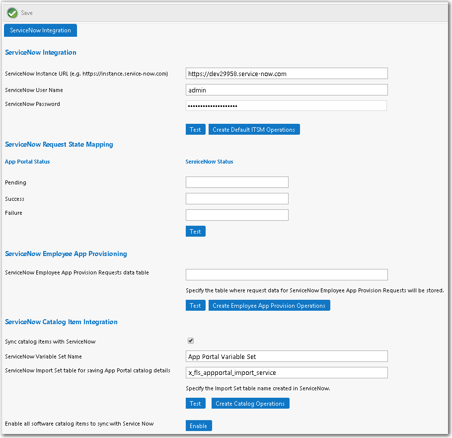 4. Under ServiceNow Integration, click Test. App Broker will connect to that instance of ServiceNow and will obtain integration settings.