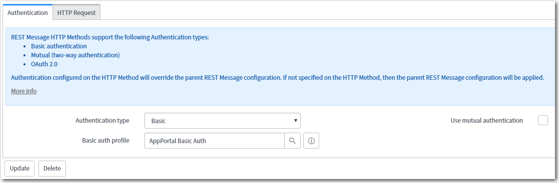4. On the Authentication tab, set Authentication type as desired for your organization. By default, None will be selected. Select the authentication type that the selected ServiceNow MID server should use to access the App Portal REST API.
