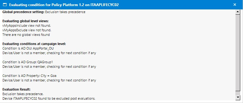The Is eligible for Alerts? column provides a link with Yes/No values and indicates whether the device is eligible for processing the alerts or not based on the conditions defined for that campaign. Clicking this link opens an Evaluating condition for <application name> on <device> pop-up with detailed information on eligibility as shown following: