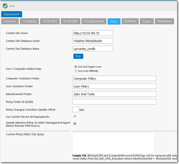 In the Central Site Database Name, enter the database name of the Altiris Notification Server database.
